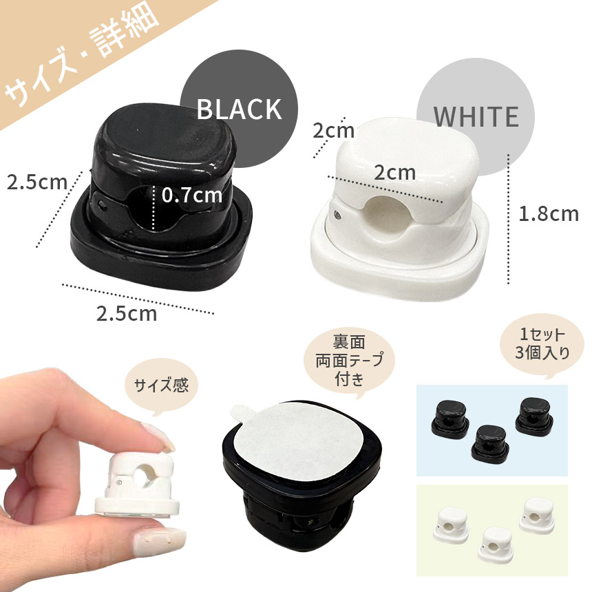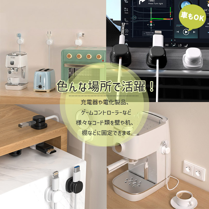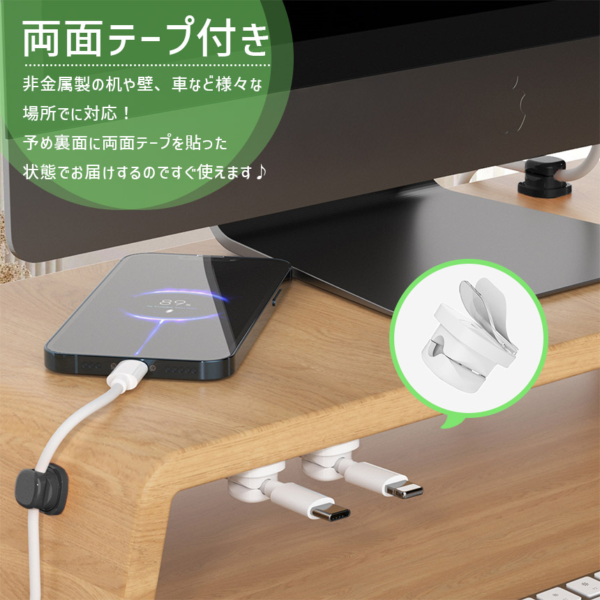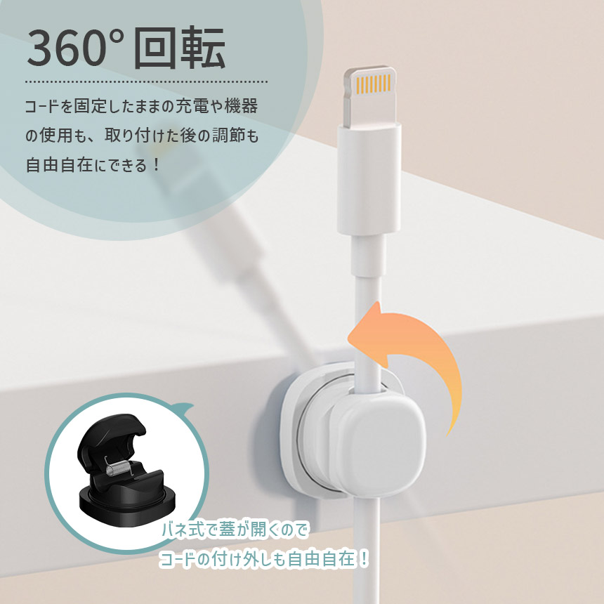 ケーブルホルダー セット 両面テープ コードホルダー 充電コード 収納 クリップ まとめる 掛ける 整理 デスク下 机 壁 車 車内 充電器 配線 コードクリップ バネ式 ブラック ホワイト 黒 白 充電ケーブル 固定 貼り付け コンセント 360°回転 開閉式 イヤホン