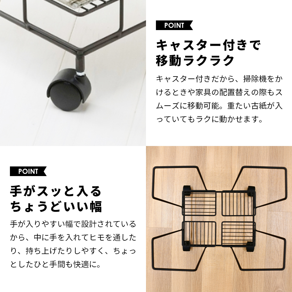 ヒモを簡単に掛けられる構造で、古紙をまとめてそのまま回収に出せるペーパーストッカー。天板付きなので、ちょっとした小物置きやサイドテーブルとしても活躍します。落ち着きのあるブラウンと清潔感のあるホワイトの2色展開。シンプルなデザインでリビングの雰囲気を損ねません。キャスター付きで移動もラクラク。丈夫なスチール製で、機能性とインテリア性を兼ね備えた一台です。 |