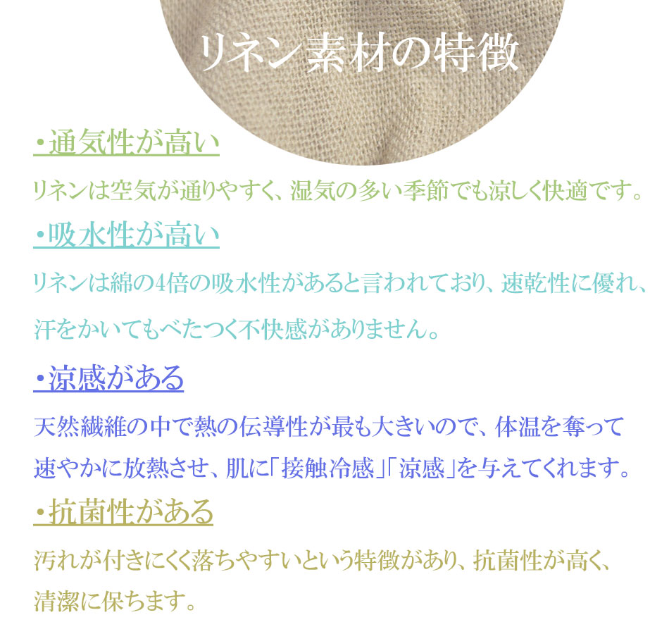 ■通気性に優れ、吸湿性、速乾性が高いので汗ばむ季節も快適。フレンチリネンにレーヨンを混紡する事でひんやり冷感
