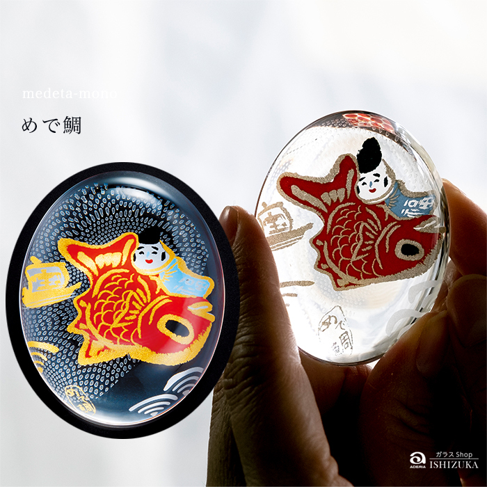・めで鯛=商売繁盛、長寿。七福神の恵比寿様が抱いている事で有名。商売繁盛の象徴とされ、鯛は長寿の魚なので長寿祈願とも謂われいています。
