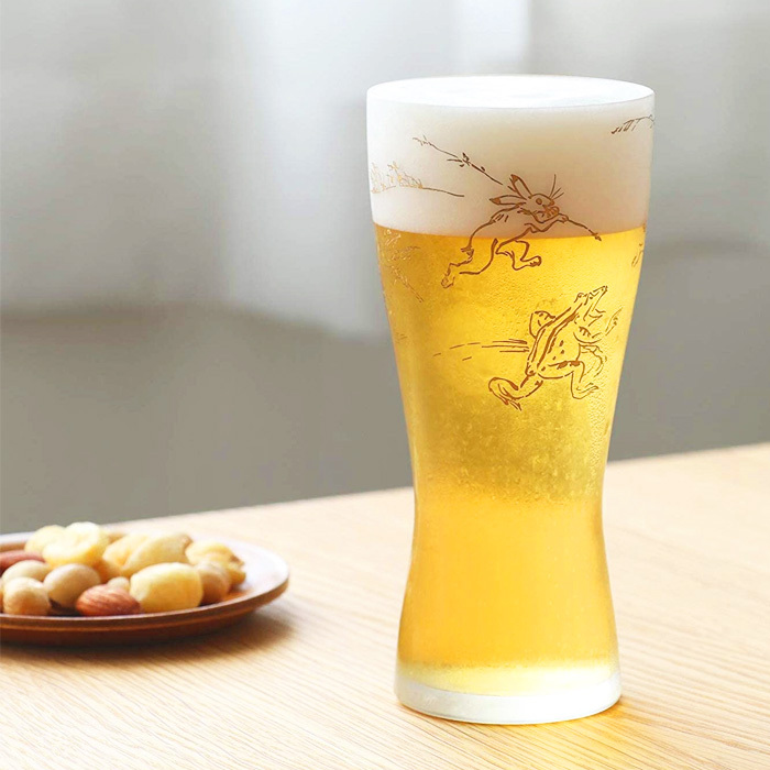 平安時代に描かれたとされる絵巻物「鳥獣戯画」を金転写でビールグラスにあしらいました。