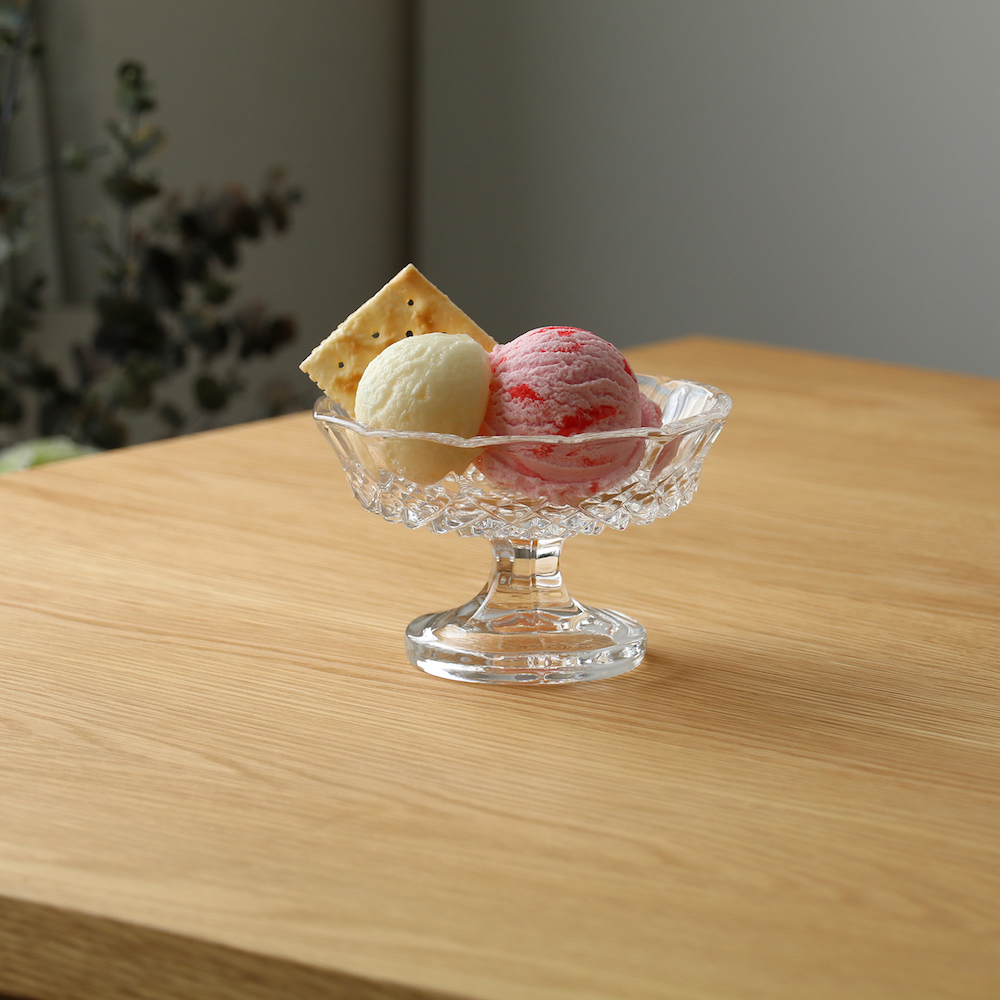 短く太い脚部と土台で、安定感のあるデザートグラスとなります。食後のデザートやスイーツの食器として最適なガラス食器です。