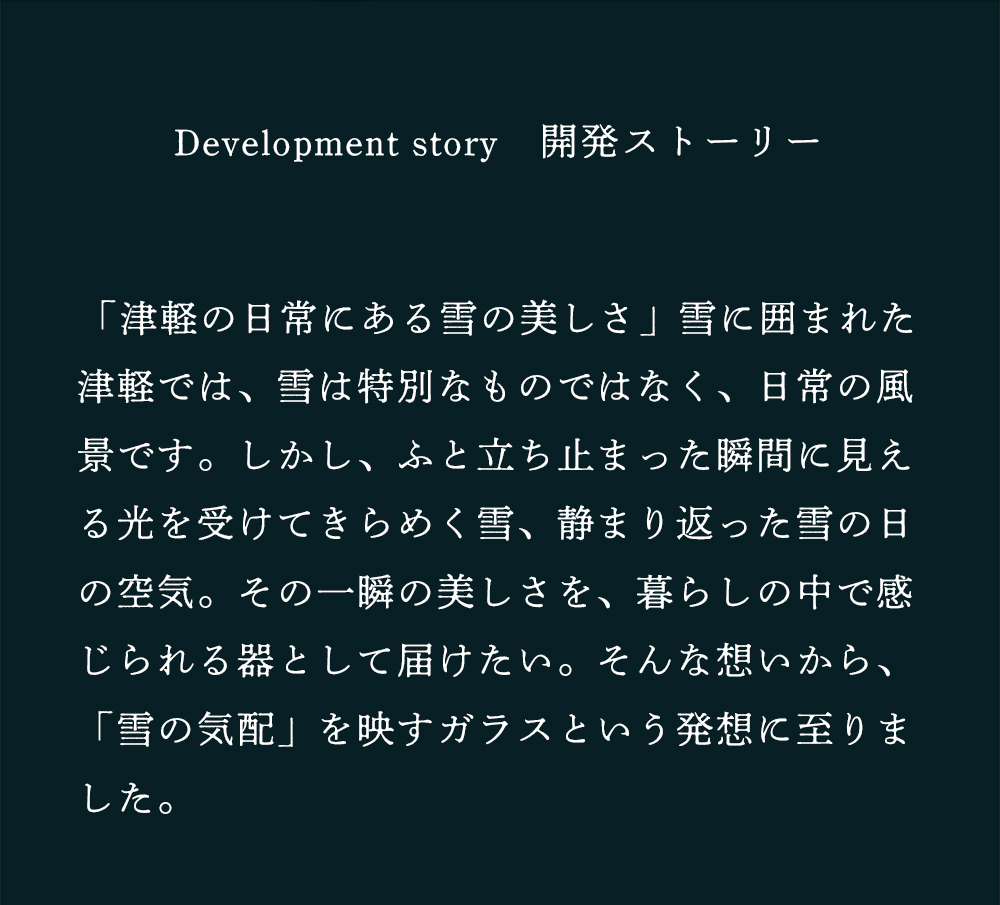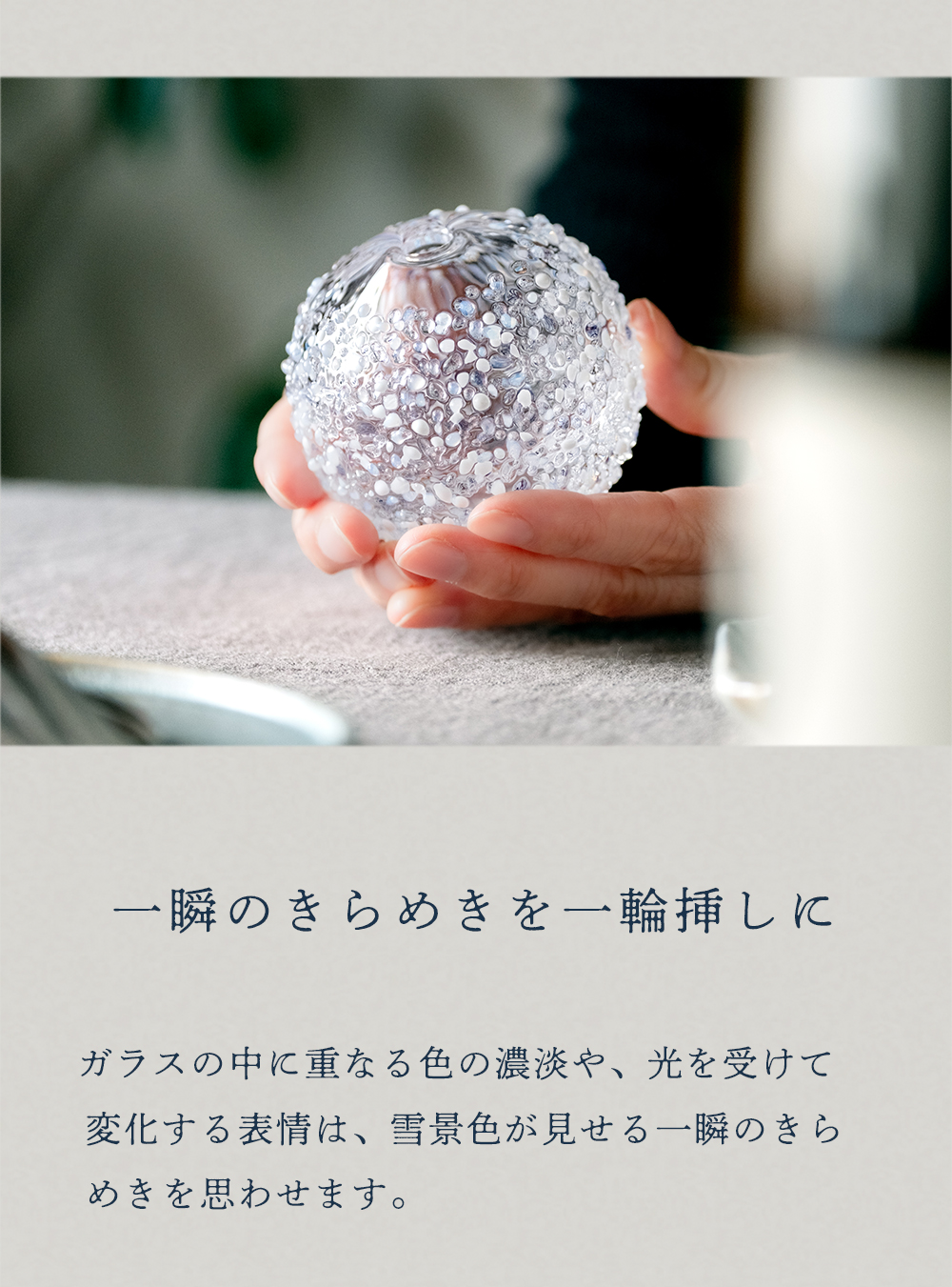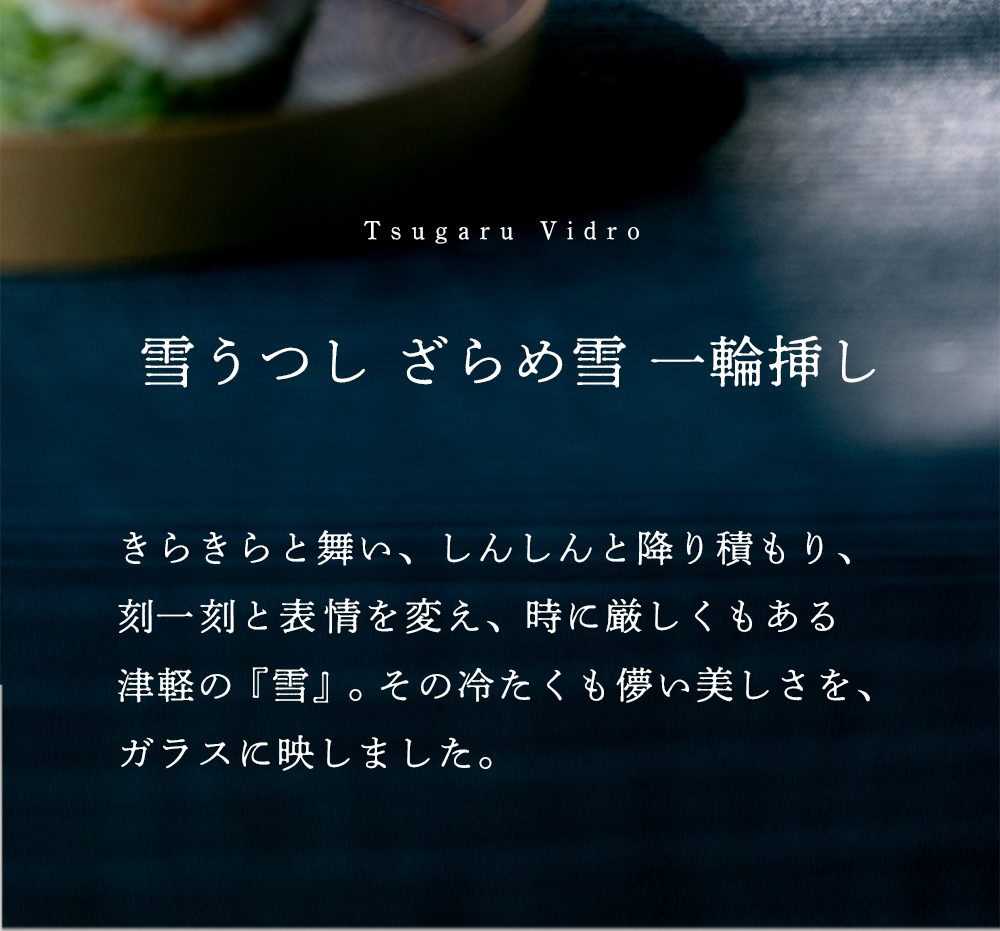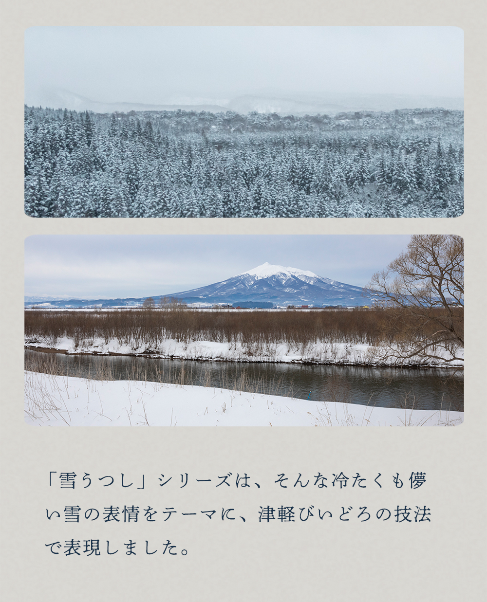 「雪うつし」は、雪の降り方や質感の違いを感じ分ける津軽七つ雪の感性をもとに、その一瞬のきらめきや気配をガラスに映したシリーズです。