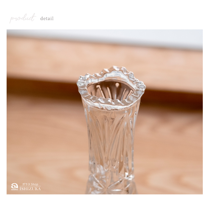 クリスタルガラス製の一輪挿し。重心を安定させるため一輪挿しの底部を分厚くしており、口部をやや開かせる事で花材が適度に拡がってくれます。