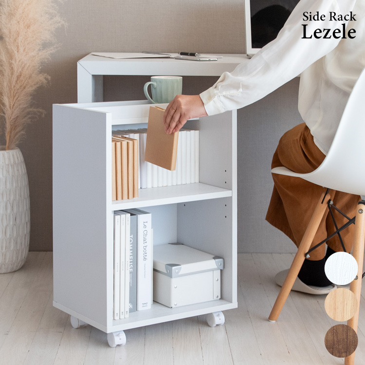 本やファイルが収納できる可動棚が付いたシンプルで美しい木目調のサイドラック『Lezele(ルゼル)』。デスク周りはもちろんリビングや寝室などお家の色々な場所でマルチに活躍します。