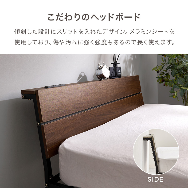 スチールフレームでスッキリとした印象のシングルベッド。ヘッドボードは傾斜があるパネル仕様です。体型に沿うように点で支え、体圧を分散するポケットコイルマットレスセット