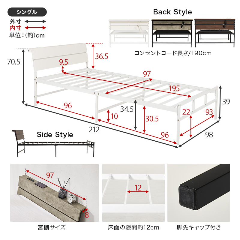 ベッド:(約)幅98×奥行212×高さ70.5×床面高34.5cm
