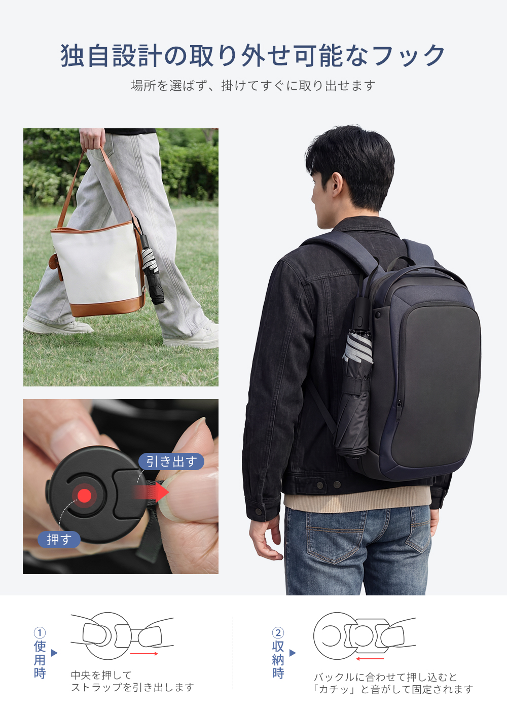 車の乗り降りや電車・バスの乗降時、お子様を連れている場面、出張や旅行時にもスムーズに使用できます。