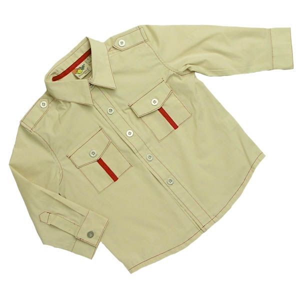 【あすつく_関東】シンプルな作りのシャツに、ステッチが格好いい一枚!メタリックな質感のボタンが格好よさをプラス!両肩にはボタンボタン付きのワンポイントがあり、ちょっぴりアーミースタイル。胸ポケットにはしっかりフタが付いていて、ボタンもあります。センターに一本ある赤いラインが素敵です!バックスタイルも凝っていて、後ろの右肩にダックビルのデザインロゴが刺繍されていてワンポイントになっています。一見硬そうな生地ですが、横ストレッチが効いていますよ♪ギフトにもぜひどうぞ。サイズ展開:85cmです。
