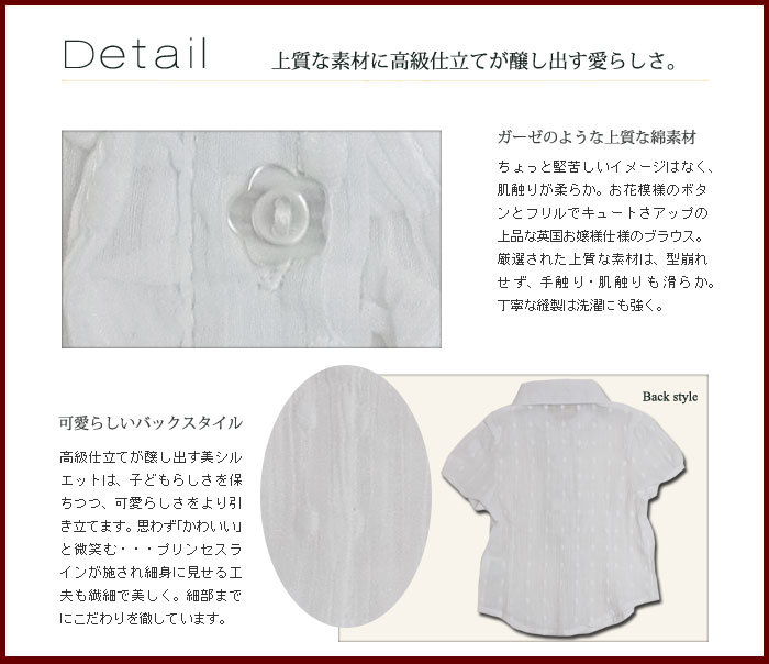 | おすすめ ポイント | 子供服 女の子キッズ。 本格仕立てのフェミニンなデザイン、春夏にびったり。 きちんと感の中のレディライクさが育ちのよさを伝わる上品なお嬢様の半袖ブラウス。無地のような無地でない、さりげない水玉模様がおしゃれ。春夏にピッタリの柔らかな上品お嬢様ブラウスです。ガーゼのような上質な綿素材は肌触りが柔らか、お花模様のボタンとフリルでキュートさアップ。ブラウスのちょっと堅苦しいイメージはなく、まるでカットソーを着ているような感じです。白一色の水玉柄に花形のボタンをあしらったフェミニンなデザイン。えりは可愛らしい丸襟で、落ち着いた上品な雰囲気を醸し出す。前縦に中央フリルがワンポイントになり、キュートさをアップ。身ごろのプリンセスラインタックで細身に見せる工夫も繊細で美しく。細部までにこだわりを徹しています。スカートにもパンツにも相性が抜群、普段着からちょっとしたおでかけご利用いただけます。日本製品にはあまり見かけないデザイン・カラフルな色使いが魅力。上品で可愛いインポートブランド子供服は、お誕生日プレゼントや出産祝いなどギフト贈答品に喜ばれます。出産祝い結婚式 面接 発表会 幼稚園 入園式 お誕生日プレゼントにおすすめ致します。 | ||