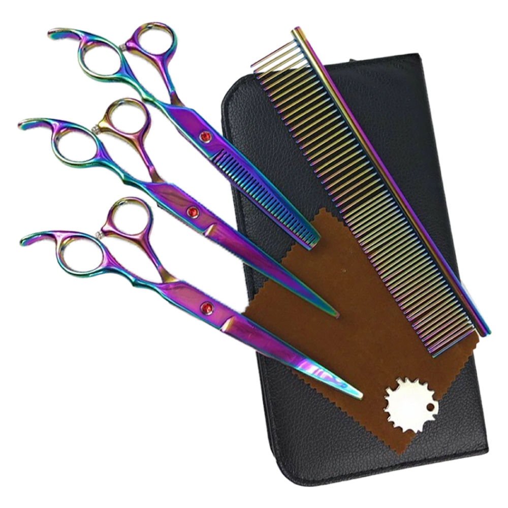 トリミングシザー4点セット ストレート カーブ セニング コーム ケース メンテナンスクロス ペット用はさみ 犬猫用ハサミ セルフカット出来る