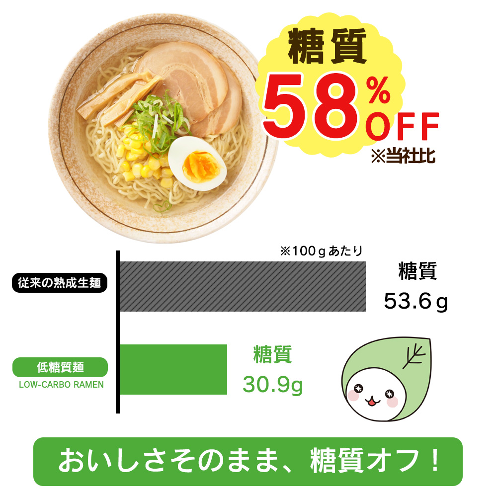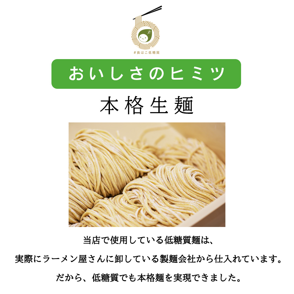 | 低糖質生麺 100g | 小麦粉(国内製造)、小麦たんぱく、でん粉、難消化性でん粉、食塩、米糠、オーツブラン/加工でん粉、ソルビット、かんすい、増粘剤(キサンタンガム)、クチナシ色素、(一部に小麦を含む) |