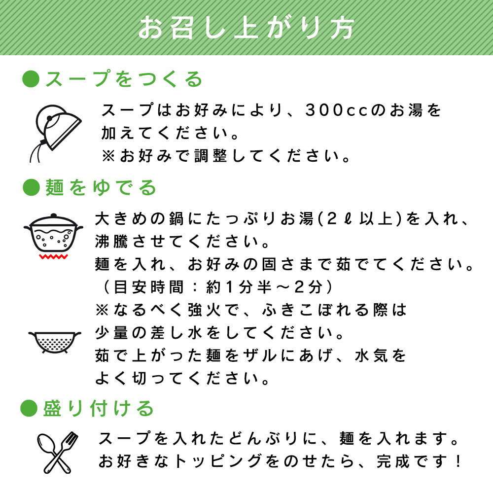 | スープの選び方 | ★お好きなスープセットを、プルダウンメニューよりお選びください。 (例)ゆず1 醤油2 野菜1→ゆず塩スープ1つと醤油スープ2つ、野菜白湯1つの合計4食セットになります。 ※【ゆず:ゆず塩スープ】【醤油:醤油スープ】【野菜:野菜白湯スープ】 ご不明な点等ございましたら、お気軽にお尋ねくださいませ。 |