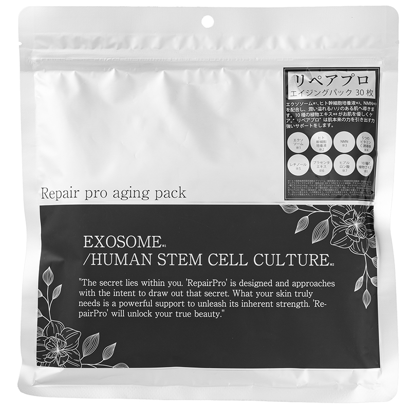 【商品名】リペアプロエイジングパック30枚入【ブランド】【JAN】4571560030166【商品説明】●エクソソーム、ヒト幹細胞培養液、NMNを配合し、潤い溢れるハリのある肌へ導きます。●10種の植物エキスがお肌を優しくケア。●リペアプロは肌本来の力を引き出すカ強いサポートをします。【使用方法】●1.洗顔後の清潔なお肌にご使用ください。●2.清潔な手でマスクを1枚取り出して広げ、目元の部分を中心にお顔にフィットさせてください。●3.5分~10分ほど置いてからマスクをはがしてください。●4.お肌に残った美容液を手のひらでなじませてください。【使用上の注意】●お肌に異常が生じていないかよく注意して使用してください。●化粧品がお肌に合わないとき即ち次のような場合には、使用を中止してください。●そのまま化粧品類の使用を続けますと、症状を悪化させることがありますので、皮膚科専門医等●にご相談されることをおすすめします。●(1)使用中、赤味、はれ、かゆみ、刺激、色抜け(白斑等)や黒ずみ等の異常があらわれた場合。●(2)使用したお肌に、直射日光があたって上記のような異常があらわれた場合。●傷やはれもの、湿しん等異常のある部位にはお使いにならないでください。●汚れや雑菌が製品に広がることを防ぐために、清潔な手でお使いください。●一度ご使用されたマスクは、衛生上、繰り返しご使用にならないでください。●目に入らないようにご注意し、目に入った時はこすらずすぐに洗い流してください。●衛生上開封後はお早めに使い切るようにしてください。●開封の際、美容液が飛び散ることがありますのでご注意ください。●袋の切り口で指などを切らないようにご注意ください。●使用後は必ずしっかりとチャックを閉めてください。●開封後はチャックを閉めても袋を横にして保管したり、チャック部分を下にして保管すると液漏れの恐れがございますので必ずチャック部分を上にして保管してください。●乳幼児の手の届かないところに保管してください。●極端に高温または低温の場所、直射日光のあたる場所には保管しないでください。【成分/原材料】水、グリセリン、DPG、BG、ヒト脂肪由来間葉系細胞エクソソーム、ヒト幹細胞順化培養液、ヒト脂肪細胞順化培養液エキス、ニコチンアミドモノヌクレオチド、ナイアシンアミド、プラセンタエキス、馬油、アスコルビルメチルカルボニルペンタペプチド-72-トリーt-ブチルトリプトファナミド、オリーブ果実油、コーン油、パルミチン酸レチノール、ハトムギ種子エキス、ツボクサエキス、トロポロン、アスコルビルリン酸Na、リン酸アスコルビルMg、パルミチン酸アスコルビルリン酸3Na、テトラヘキシルデカン酸アスコルビル、アスコルビル【生産国/原産国】