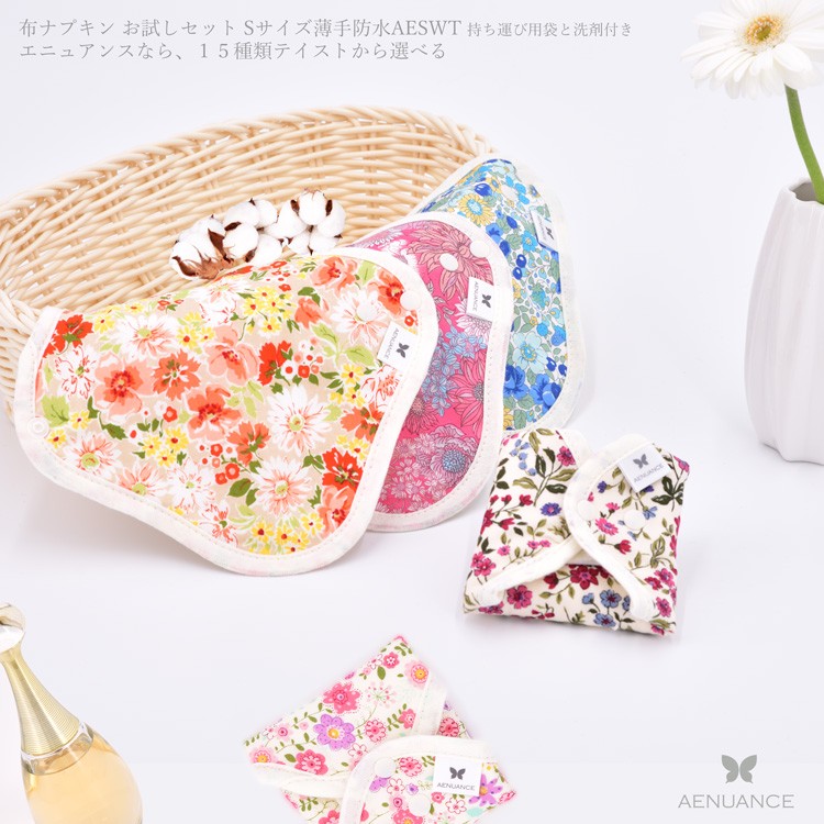 パッケージ内容1.布ナプキンS号薄手防水布入り 品番:AESWT 1枚軽い日からふつうの日の昼用の生理ナプキンです。