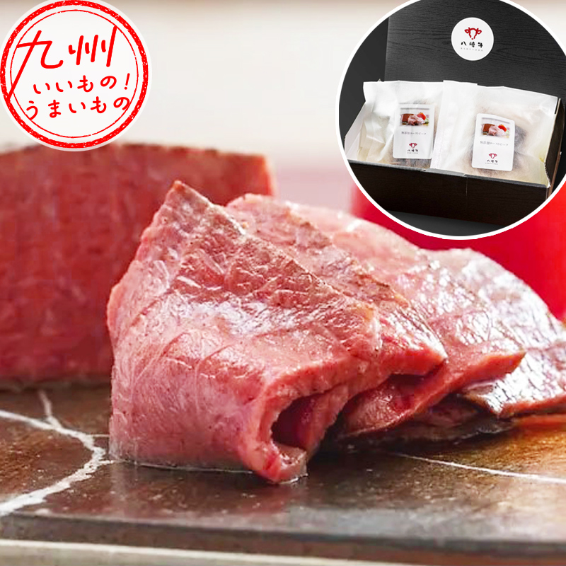 贈答用に人気の「無添加ローストビーフ」です。無添加ローストビーフ。自社牧場・鏡山牧場でのびのびと過ごした八崎牛のモモ肉を使用した、柔らかくてジューシーなローストビーフです。岩塩と黒胡椒のみで味付けしており、アミノ酸などの添加物は一切使用していません。薄くスライスし、八崎牛ならではの濃厚な美味しさをご堪能ください。眼下には日豊海岸のリアス式海岸と紺碧の海が見渡せ、頭上には南九州の青い空が広がる標高645メートルの「鏡山牧場」。頭数制限された八崎牛は、ここで放牧されて伸び伸びと育ちます。牛は「牛らしく」自由に育てる。 八崎牛の「旨味」を引き出す大切な要素だと考えます。最高の環境で育った牛と最高の熟成技術が組み合わさることで極上の八崎牛が誕生しました。