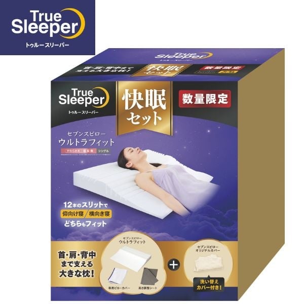 「トゥルースリーパーセブンスピローウルトラフィット」は12本のスリットが入った、ウルトラフィットカット構造により、従来品に比べ横向き寝のフィット性が向上しました。頭から背中まで七つの部位を支える設計。大きなサイズであなたをつつみ首・肩・背中までラク〜な枕。さらにオリジナルカバーが付いた特別セット