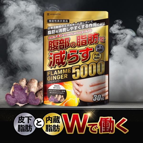 落ちづらくなったお腹の脂肪に「フラムジンジャー」が効く! ブラックジンジャー由来ポリメトキシフラボンには、日常活動時のエネルギー代謝において脂肪を消費しやすくする作用により、BMIが高めの方の腹部の脂肪を減らす機能が実証済み。 (届出番号:I175) フラムジンジャーには、ブラックジンジャー49,500mgから抽出した有用成分をギュっと一袋に。 さらに、カプサイシン・カテキン・L-カルニチン・BCAAと、サポート成分も充実。 そのお腹の脂肪、諦めていませんか?フラムジンジャーですっきり理想の体型を目指しましょう。