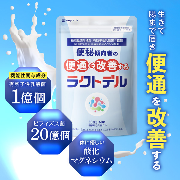 有胞子性乳酸菌のチカラで便秘傾向者の"便通を改善する"「ラクトデル」。 頑固なお悩みが楽っと出る、機能性表示食品のサプリメントです。(届出番号:H1023) 胃酸に強い1億個の有胞子性乳酸菌が生きて腸まで届き、体内フローラを元気に。 さらに植物性乳酸菌、ビフィズス菌、酪酸菌も配合で、さらに善玉菌を応援。腸内環境の乱れからくるお腹の不調を改善します。 ラクトデルに配合されているのは乳酸菌だけではありません。 善玉菌を届けるプロバイオティクスと善玉菌を育てるプレバイオティクスの両方を取り入れた、最新の研究に基づく「シンバイオティクス」の考えを取り入れたサプリメントです。 ミルクオリゴ糖や酪酸菌も配合し、体内フローラをどんどん元気にするマルチ乳酸菌サプリメントです。