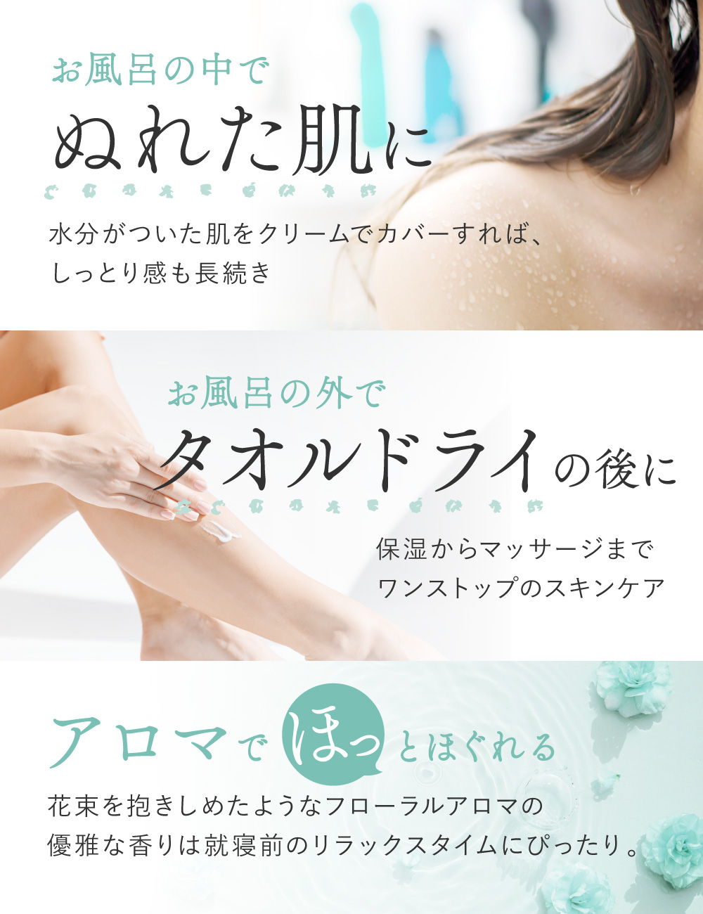 ●お風呂の中でも、外でも使えるボディミルクお風呂の中でぬれた肌にお使いいただけます。水分がついた肌をミルクでカバーすれば、しっとり感も長続き。お風呂の外では、タオルドライの後にご使用いただけ、保湿からマッサージまでワンストップのスキンケアを叶えます。