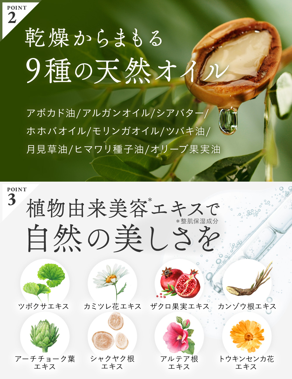 ●【ポイント2】しっかり保湿する9種のオイルアボカド油、アルガンオイル、シアバター、ホホバオイル、モリンガオイル、ツバキ油、月見草油、ヒマワリ種子油、オリーブ果実油配合。天然のオイルがしっかりと保湿します。