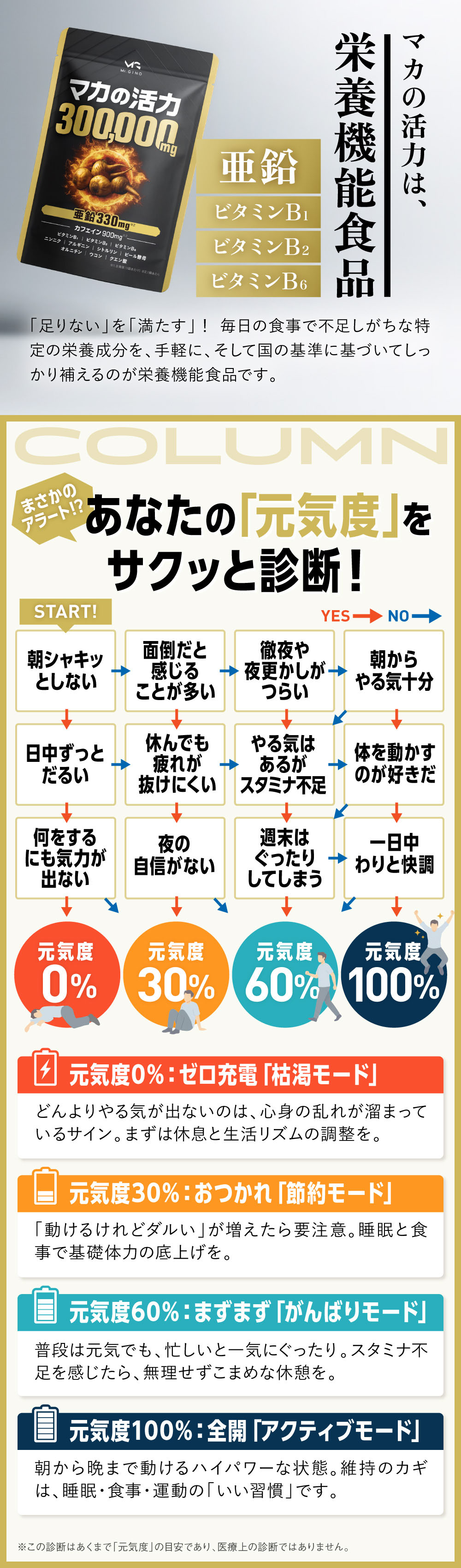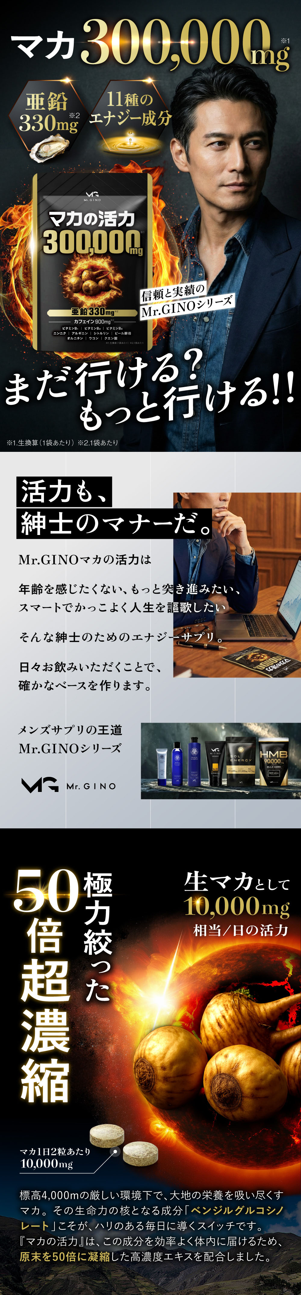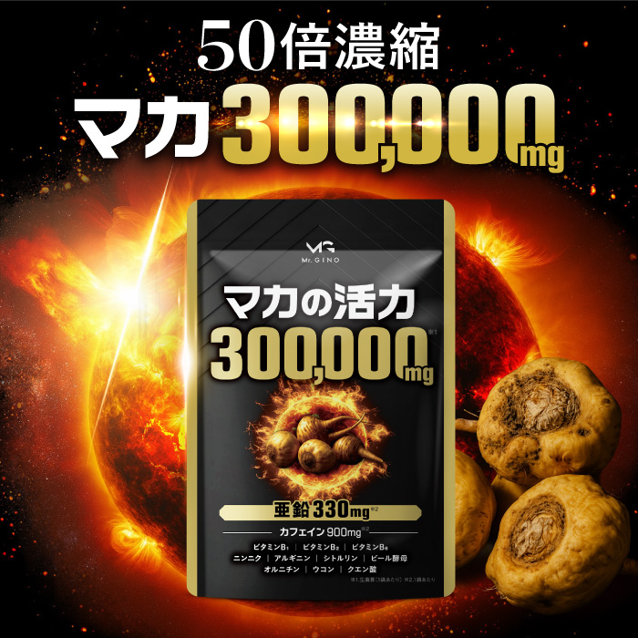 ●紳士のための「確かなベース作り」 「Mr.GINOマカの活力」は、マカを300,000mg 配合※した年齢に負けたくない、活動的な毎日を送りたいと願う、あなたのためのバイタルサプリメントです。