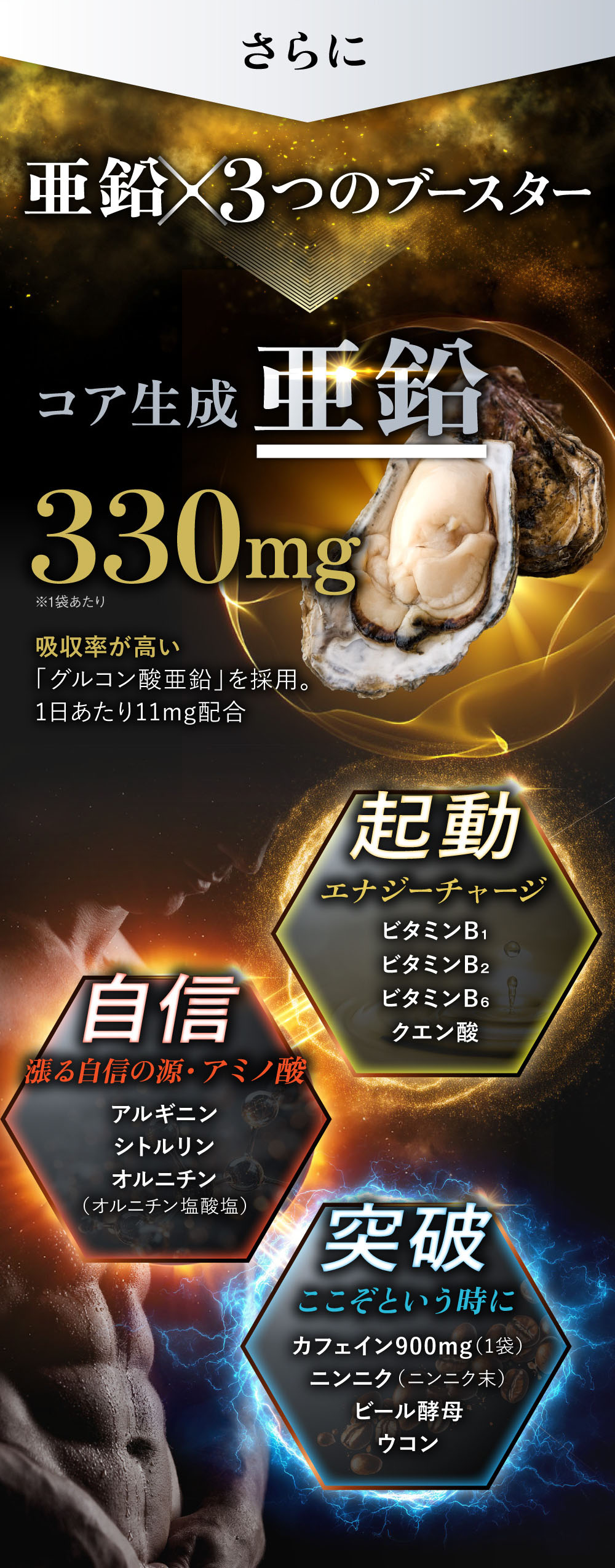 ●亜鉛と11種の「ブースター成分」による多角的なアプローチ マカの力を引き出すため、男性の健康維持に必須の亜鉛と、エナジーサイクルを応援する3つの厳選成分を配合。計11種の成分が、健康の土台づくりを多角的にサポートします。