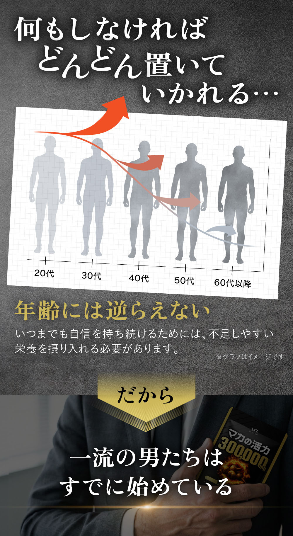 ・いつまでもスマートでかっこよく人生を謳歌したい。 毎日たった2粒お飲みいただくことで、活力の源泉となる確かなベース作りをサポートします。