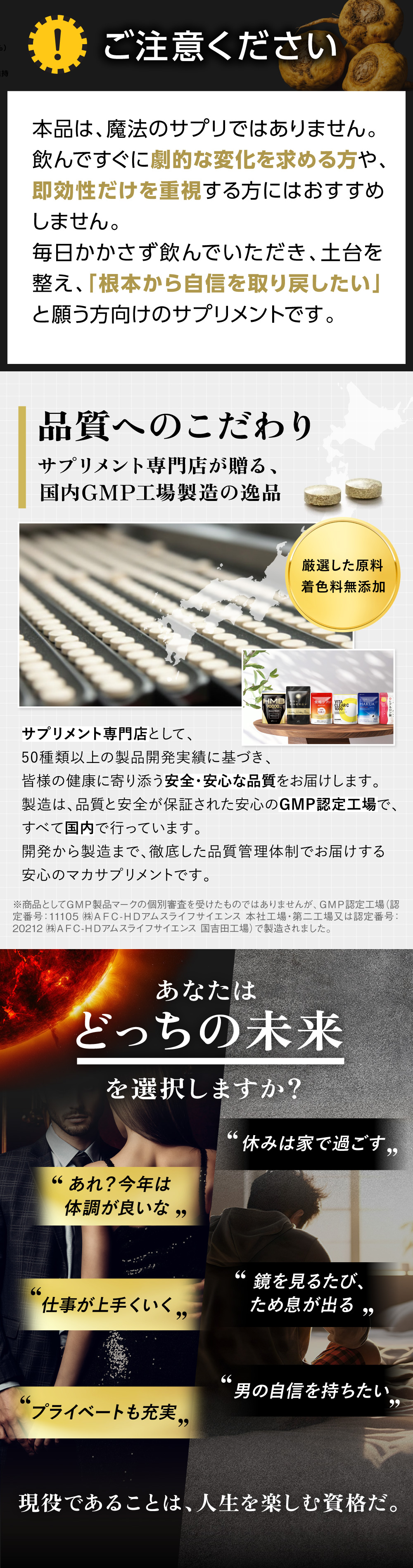 ・短期間での変化だけを重視する方にはおすすめしません。 毎日欠かさず飲んでいただき、活力の土台を整え、「根本から確かな自信を取り戻したい」と願う方向けのサプリメントです。 まずは3ヶ月、日々の習慣としてお試しください。