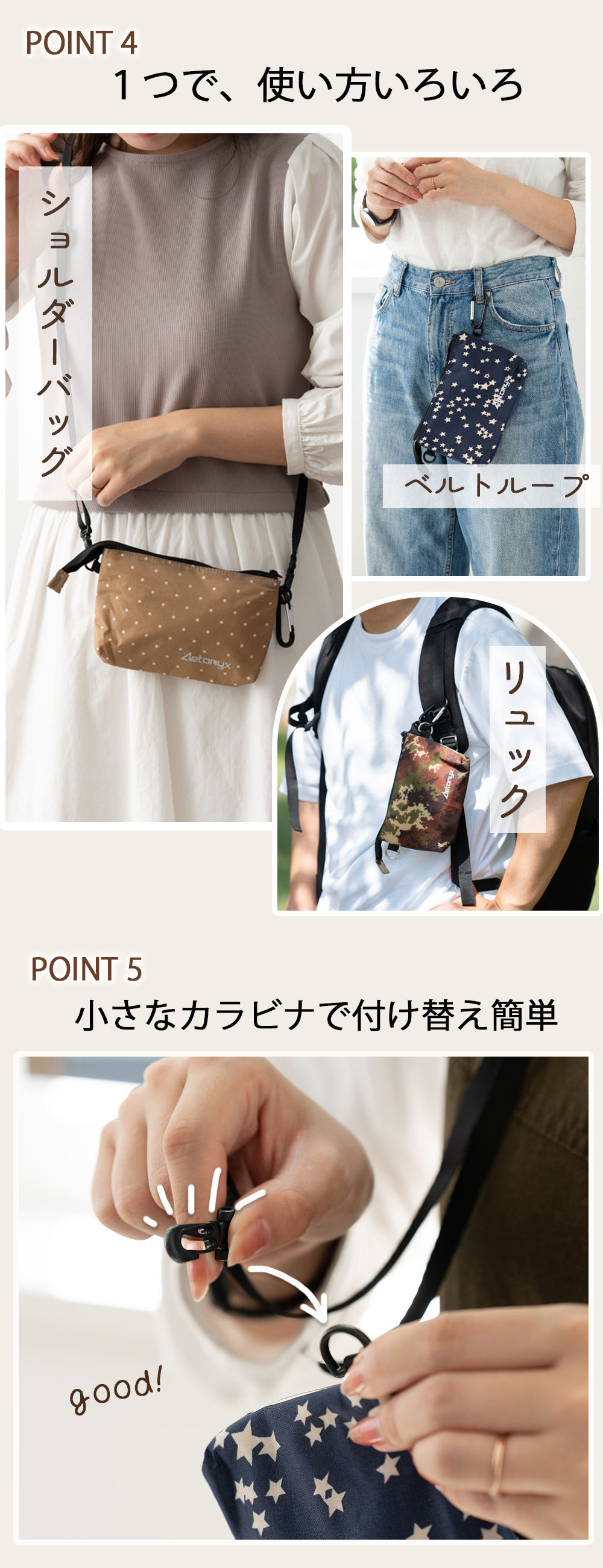 ショルダー紐は取り外し可能でカラビナ付きなので、ベルトループやリュックに付けたりとシーンに合わせてお使いいただけます。