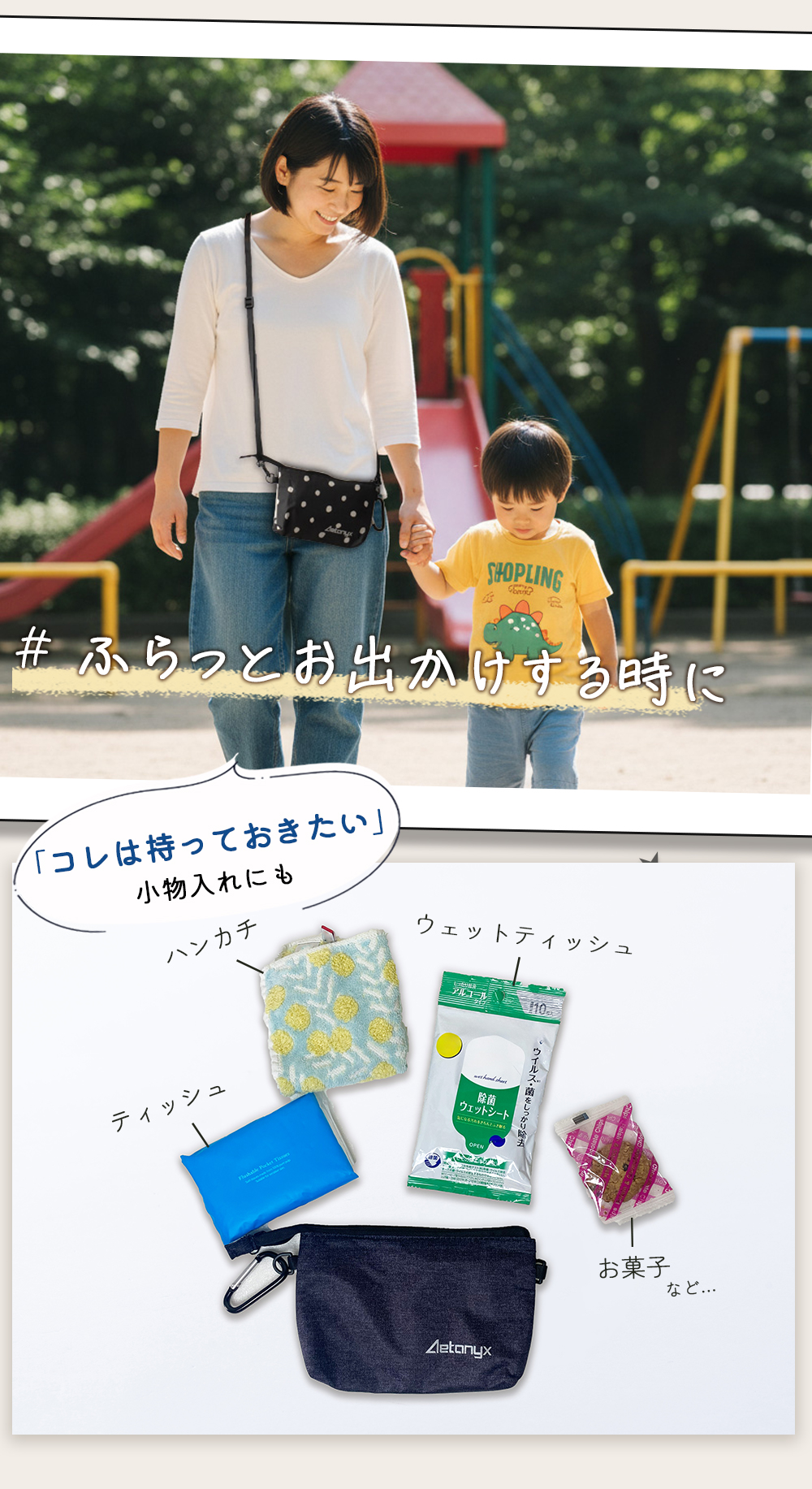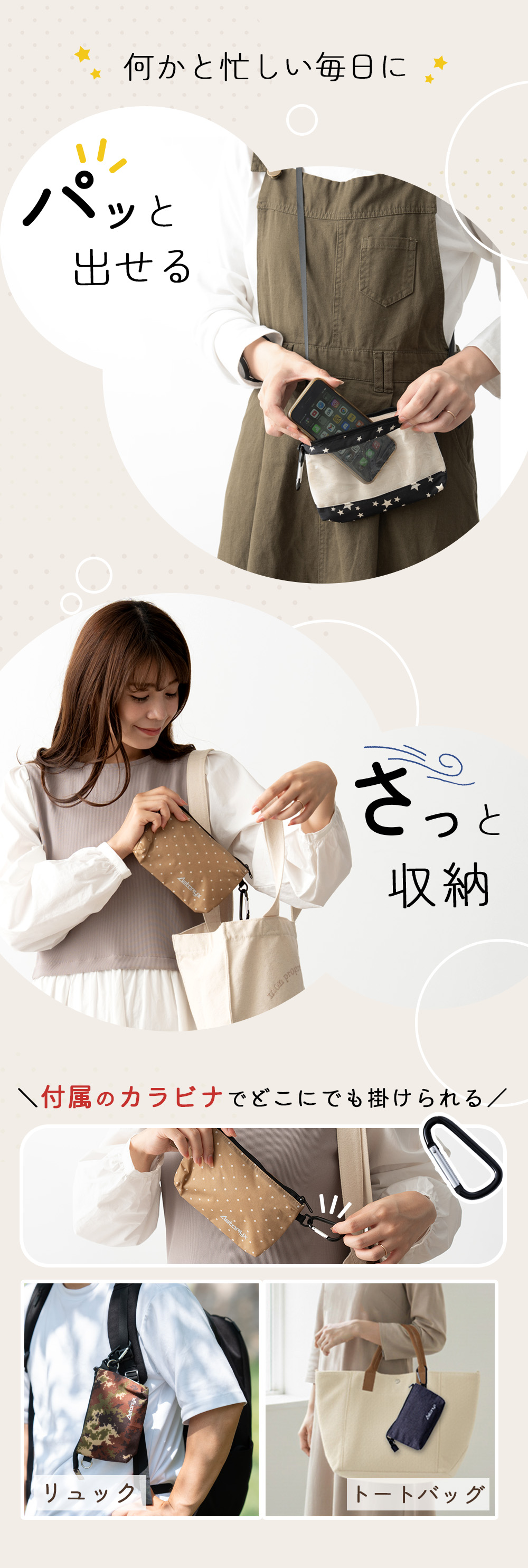 スマホや携帯以外にも、鍵やハンカチ、お金やカード類、マスクやイヤホン、のど飴やガム等々・・・ちょっとした小物が入るから便利!