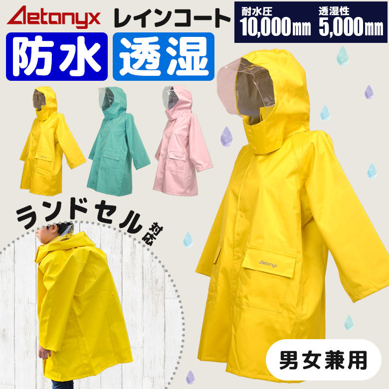 ランドセルを背負ったまま着用できる、子供用のマチ付きレインコート(男女兼用)!防水・防風・透湿の三層構造で、雨や風を防ぎながら発汗による群れを軽減します。