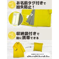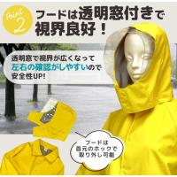 ホックで取り外し可能な透明窓付きフードで雨の日でフードを被っていても視界が開けて安全です。コンパクトに収納できる収納袋付き。お名前タグも付いています。