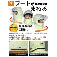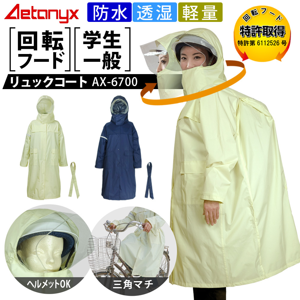 回転フードで左右の確認がしやすい、リュックを背負いながら着用できるヘルメット対応の軽量レインコートです。