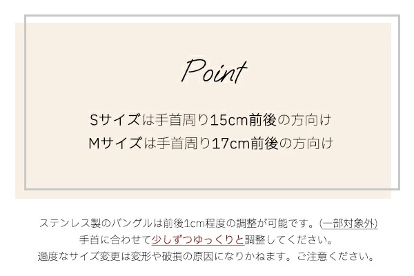 | サイズ | Sサイズ:内径 約55mm、幅 約3〜5.5mm、厚み 約2mm Mサイズ:内径 約60mm、幅 約3〜5.5mm、厚み 約2mm |