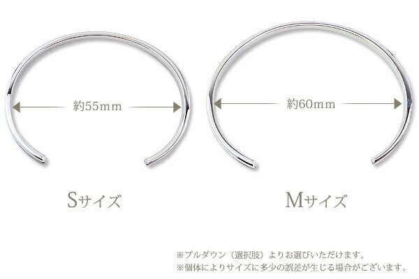 | サイズ | Sサイズ:内径 約55mm、幅 約2.5〜5mm、厚み 約2.2mm Mサイズ:内径 約60mm、幅 約2.5〜5mm、厚み 約2.2mm |