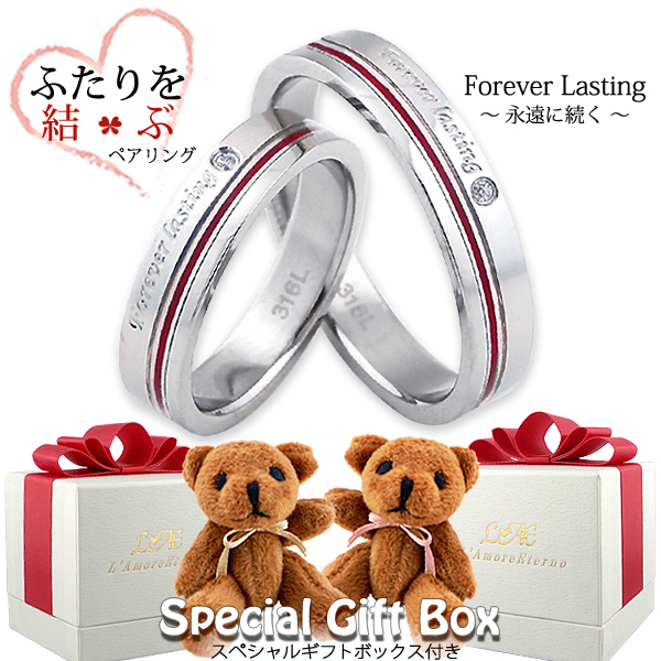 | コメント | 表面にForever Lasting (永遠に続く...)のデザインメッセージと一粒のストーン、ふたりを結ぶ糸が途切れることなく一周入ったペアリングです。 医療用に使われているサージカルステンレスは、肌に優しく金属アレルギーでアクセサリーをつけられない方にも安心◎ シルバーアクセサリーより軽くて丈夫で変色しにくい素材で、お手入れもティッシュなどでサッと拭くだけでカンタンです! 注意:お風呂や温泉で変色しにくいですが、外していただく事をおススメいたします。また、天然石や宝石・樹脂加工のある商品は石取れやクスミ・剥がれの原因になりますので水回りはできるだけ避けるようお願いします。 ※ベアー付きスペシャルボックスが付いてます。 |