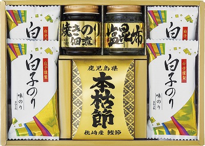 ●商品内容:白子のり味のり(8切5枚入)×4、焼きのり入佃煮(85g)・塩昆布(18g)・枕崎産本枯節(2.5g×2袋)×各1