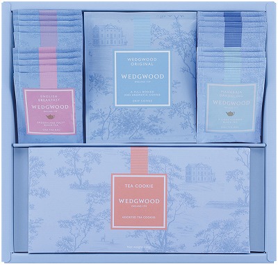 ●商品内容:イングリッシュ ブレックファスト・アールグレイ・ウェッジウッドオリジナル・マハラジャダージリン(各2g)×各5、オリジナルドリップコーヒー(10g)×3、ティークッキーアソート(アップル・レモン)(各80g)×各1