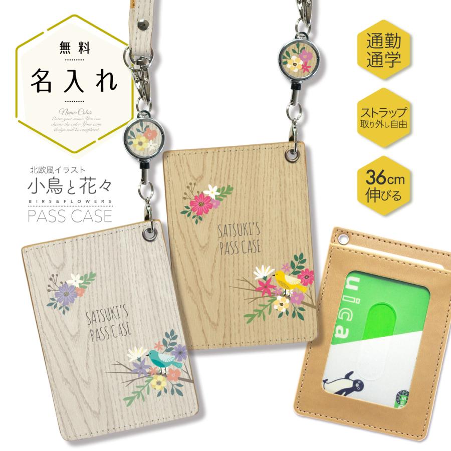 オリジナルネーム パスケース ICカード カード 定期入れ IDカード リール付き シンプル 木目 鳥 名前入り