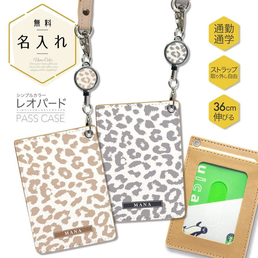 オリジナルネーム パスケース ICカード カード 定期入れ IDカード リール付き シンプル レオパード ヒョウ柄 名前入り