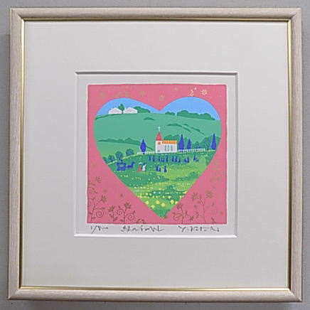 | ◎吉岡浩太郎版画についてシルクスクリーンとジグレスクリーンの2種類の版画技法によって制作されています。 ・シルクスクリーン版画とは、絹の繊細な織布の上に製版し、熟達した高度な摺り技術により 一色ごとに丹念に摺りあげていく多色刷版画です。 ・ジグレスクリーン版画とは、デジタル技法による精密機器を利用したアートでコンピュータにより 色彩分析を行いプリントされています。さらに、耐光性を強まるためにシルクスクリーンによる 表面処理がされています。 ◎エディションとは、作品左下にある限定数をいいます。分母が刷り数で分子が通し番号です。 通し番号に価値の違いはありません。また、追加再販には、Sまたは’があります。 APナンバーは作家所有のエディションナンバーです。 | |