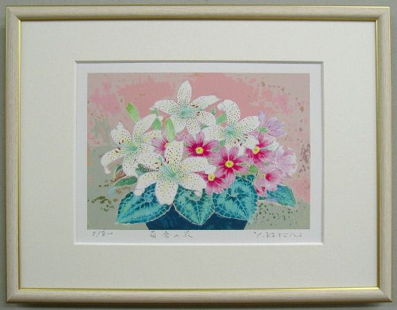 | ◎吉岡浩太郎版画についてシルクスクリーンとジグレスクリーンの2種類の版画技法によって制作されています。 ・シルクスクリーン版画とは、絹の繊細な織布の上に製版し、熟達した高度な摺り技術により 一色ごとに丹念に摺りあげていく多色刷版画です。 ・ジグレスクリーン版画とは、デジタル技法による精密機器を利用したアートでコンピュータにより 色彩分析を行いプリントされています。さらに、耐光性を強まるためにシルクスクリーンによる 表面処理がされています。 ◎エディションとは、作品左下にある限定数をいいます。分母が刷り数で分子が通し番号です。 通し番号に価値の違いはありません。また、追加再販には、Sまたは’があります。 APナンバーは作家所有のエディションナンバーです。 | |