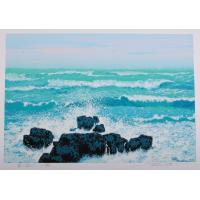 池上壮豊先生がシルクスクリーンの版画で制作した海の絵「蒼い海から」は、海のブルーと白い波、黒い岩のコントラストがとても美しい海の絵です。