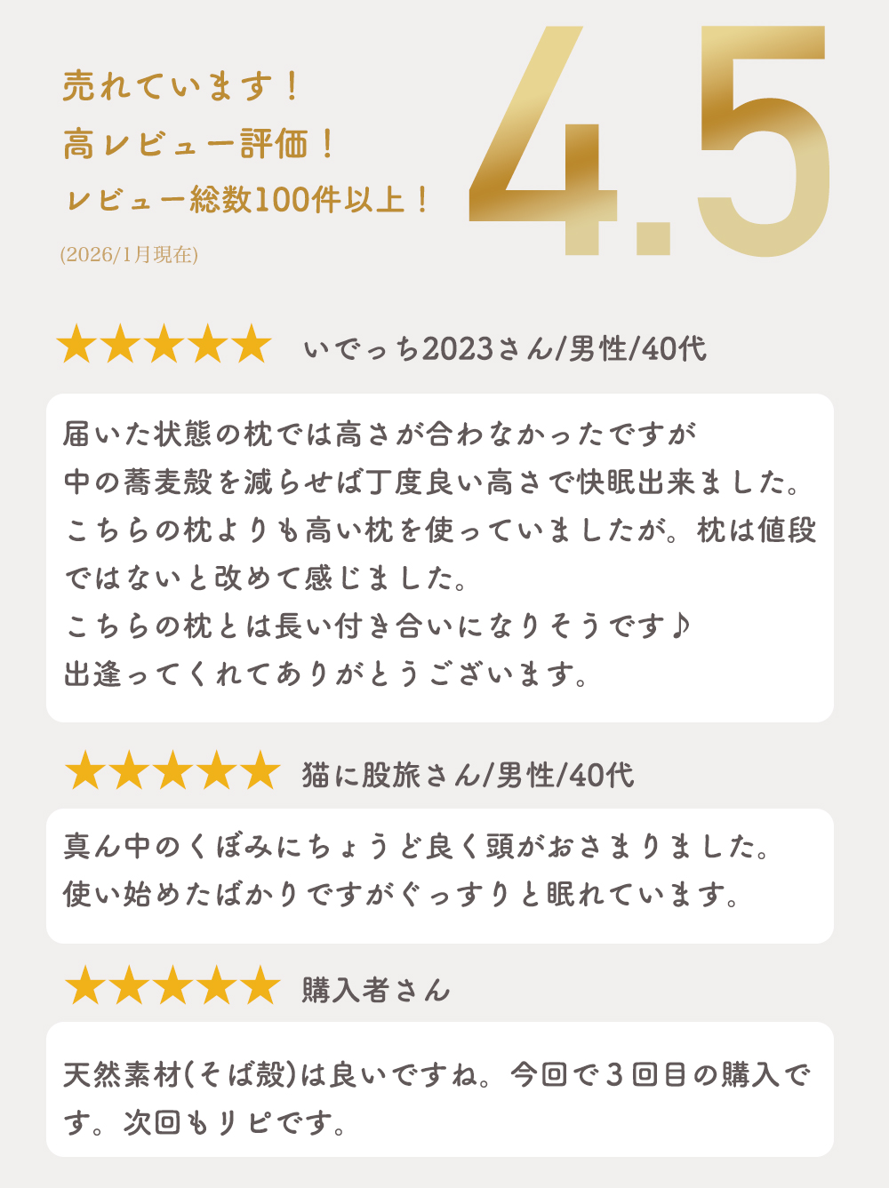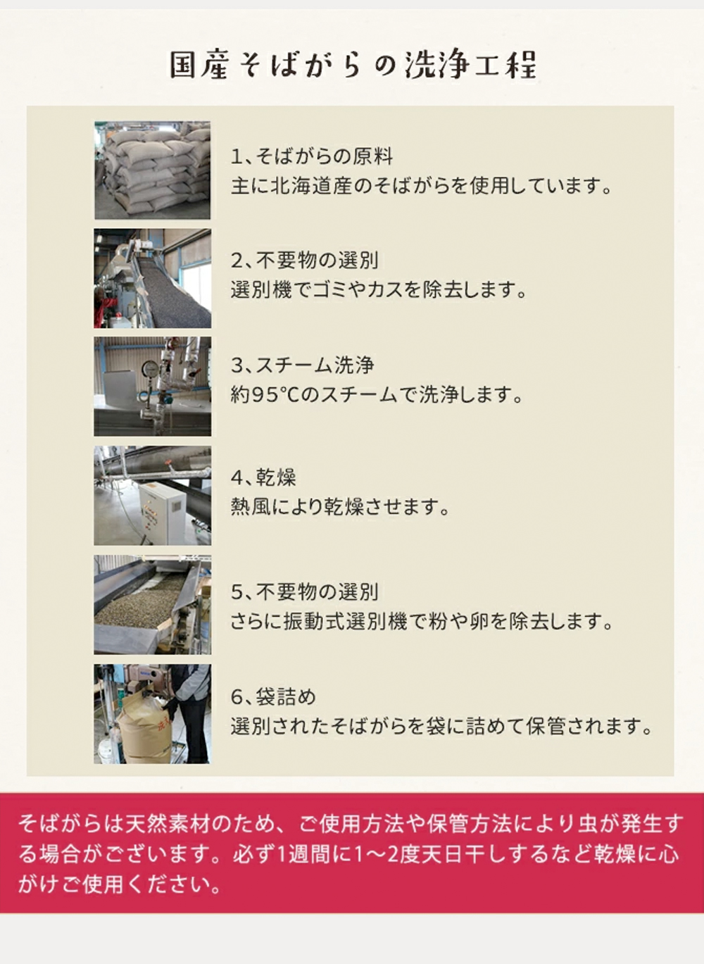 □商品到着後、速やかに外装袋からお出しください。熱・洗浄による防虫処理済みのそばがらを使用していますが、高温多湿の環境下で保管している場合、虫が発生する場合がございます。