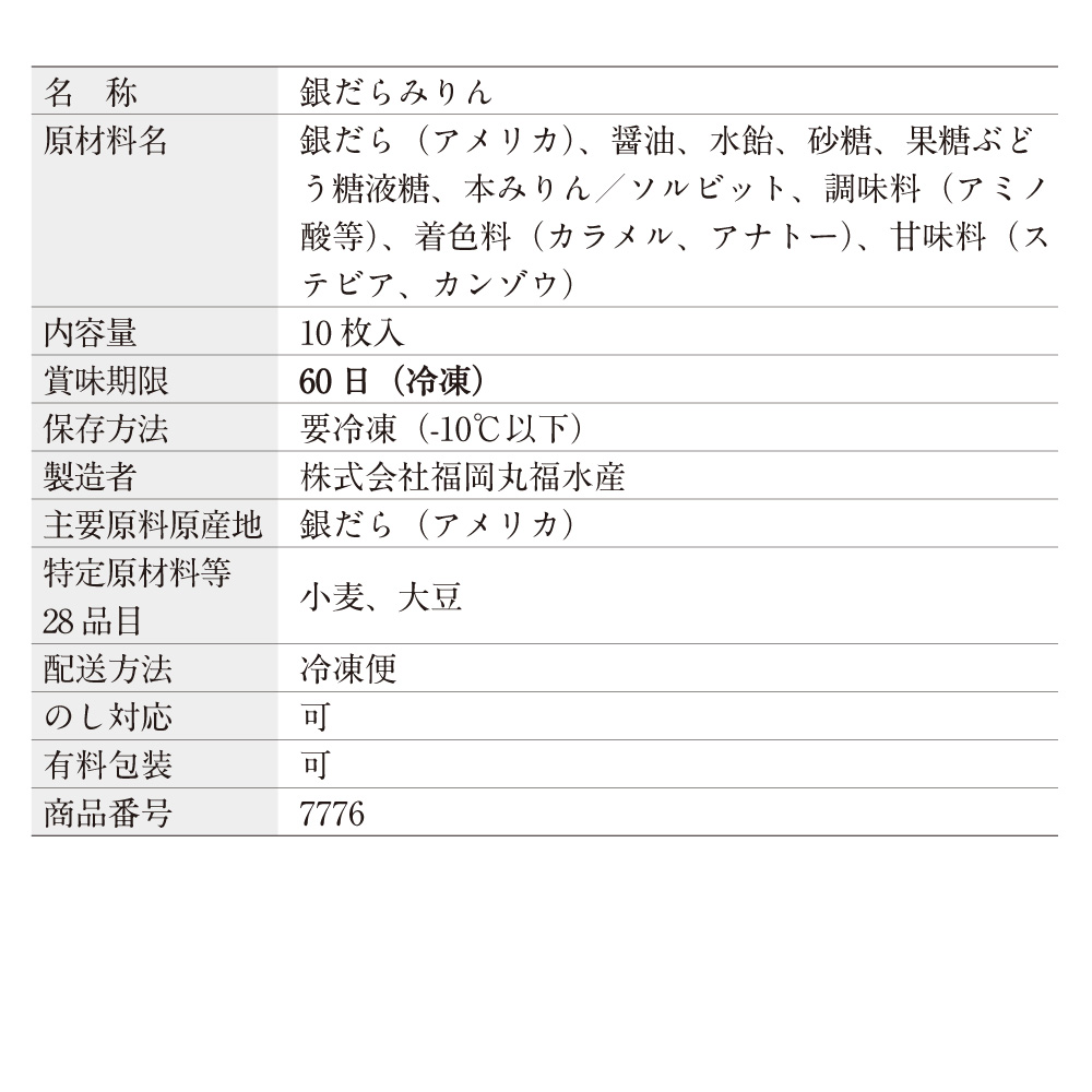 原材料名:銀だら(アメリカ)、醤油、水飴、砂糖、果糖ぶどう糖液糖、本みりん/ソルビット、調味料(アミノ酸等)、着色料(カラメル、アナトー)、甘味料(ステビア、カンゾウ)