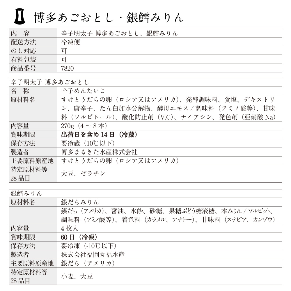 明太子 辛子明太子 博多あごおとし・銀鱈みりん