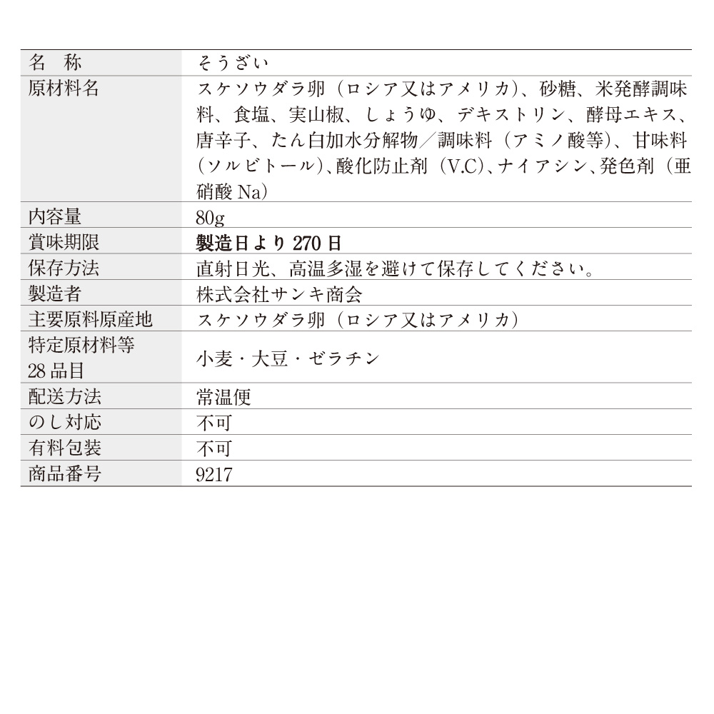 原材料名:スケソウダラ卵(ロシア又はアメリカ)、砂糖、米発酵調味料、食塩、実山椒、しょうゆ、デキストリン、酵母エキス、唐辛子、たん白加水分解物/調味料(アミノ酸等)、甘味料(ソルビトール)、酸化防止剤(V.C)、ナイアシン、発色剤(亜硝酸Na)