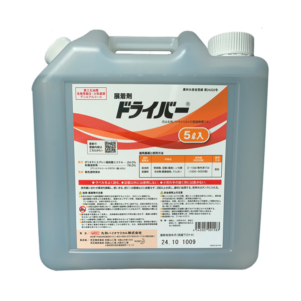 ■登録番号:第24222号 ■種類名:展着剤 ■有効成分:ポリオキシエチレン脂肪酸エステル24.0% ■性状:無色透明液体 ■包装:5000ml |
