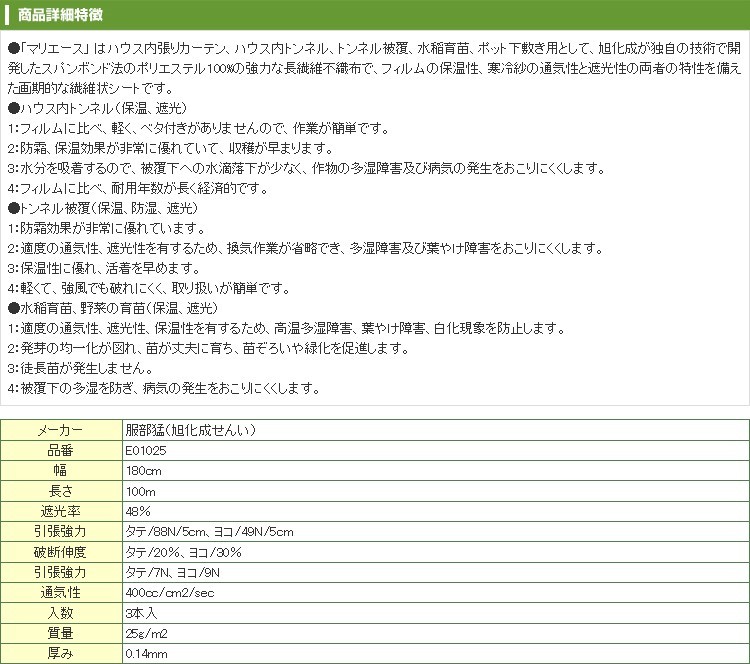 服部猛(旭化成せんい) トンネル・育苗用 不織布 E01025 マリエース 180cm×100m 3本入